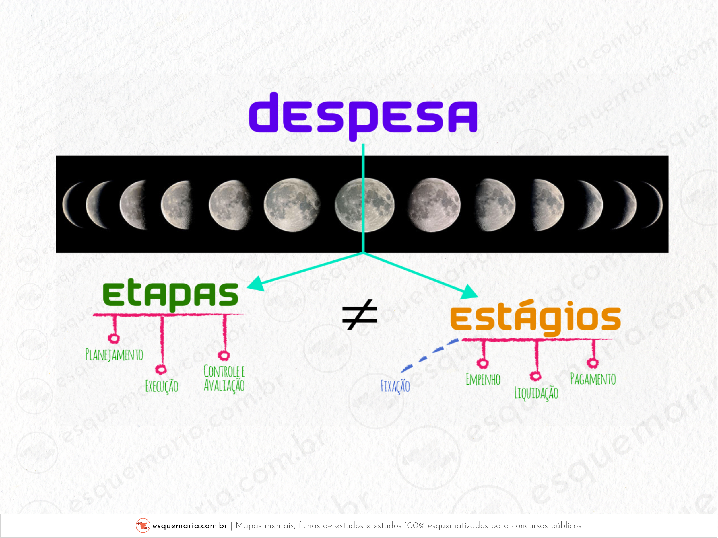 Já os estágios da despesa dizem respeito à fixação (planejamento) e ao empenho, à liquidação e ao pagamento (execução). Importante: muitas vezes, a banca só considera mesmo os estágios de ELP (empenho, liquidação e pagamento). |