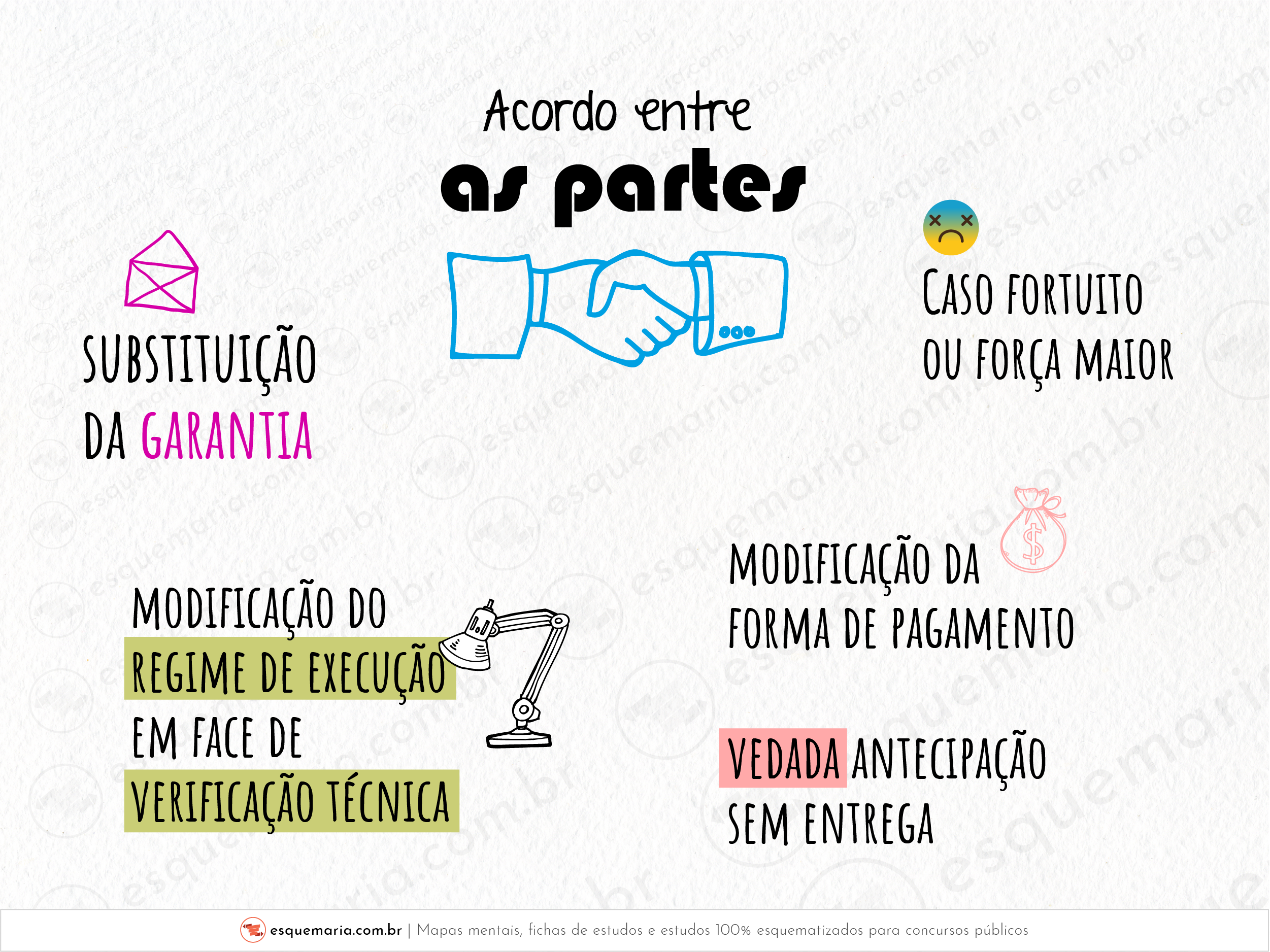 Eu vou deixar aqui todas as hipóteses de "acordo entre as partes" da NLL, combinado? Art. 124. Os contratos regidos por esta Lei poderão ser alterados, com as devidas justificativas, nos seguintes casos: (...) II - por acordo entre as partes: a) quando conveniente a substituição da garantia de execução; b) quando necessária a modificação do regime de execução da obra ou do serviço, bem como do modo de fornecimento, em face de verificação técnica da inaplicabilidade dos termos contratuais originários; c) quando necessária a modificação da forma de pagamento por imposição de circunstâncias supervenientes, mantido o valor inicial atualizado e vedada a antecipação do pagamento em relação ao cronograma financeiro fixado sem a correspondente contraprestação de fornecimento de bens ou execução de obra ou serviço; d) para restabelecer o equilíbrio econômico-financeiro inicial do contrato em caso de força maior, caso fortuito ou fato do príncipe ou em decorrência de fatos imprevisíveis ou previsíveis de consequências incalculáveis, que inviabilizem a execução do contrato tal como pactuado, respeitada, em qualquer caso, a repartição objetiva de risco estabelecida no contrato. (...) § 2º Será aplicado o disposto na alínea “d” do inciso II do caput deste artigo às contratações de obras e serviços de engenharia, quando a execução for obstada pelo atraso na conclusão de procedimentos de desapropriação, desocupação, servidão administrativa ou licenciamento ambiental, por circunstâncias alheias ao contratado. | |