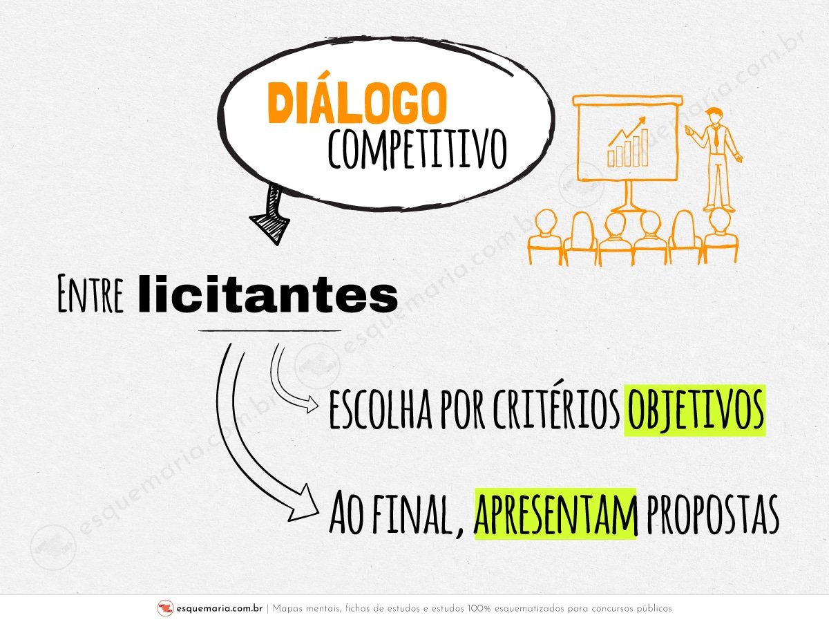 Art. 6º da NLL: XLII - diálogo competitivo: modalidade de licitação para contratação de obras, serviços e compras em que a Administração Pública realiza diálogos com licitantes previamente selecionados mediante critérios objetivos, com o intuito de desenvolver uma ou mais alternativas capazes de atender às suas necessidades, devendo os licitantes apresentar proposta final após o encerramento dos diálogos; |